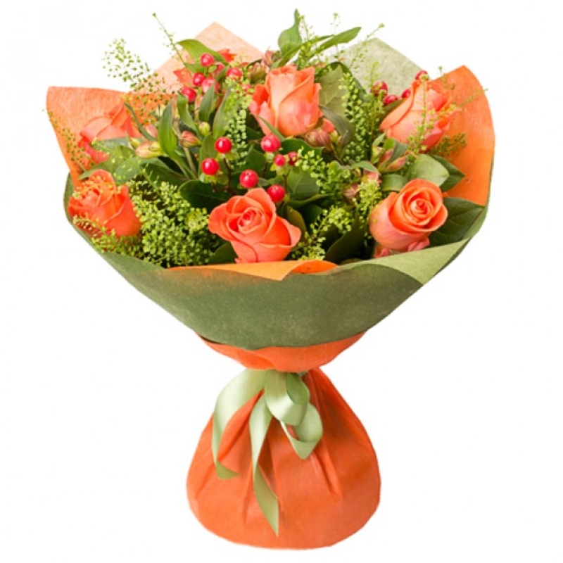 Букет состоит из 7 оранжевых роз, 5 альстромерий, 3 гиперикум, зелень, красивая упаковка, атласная лента.