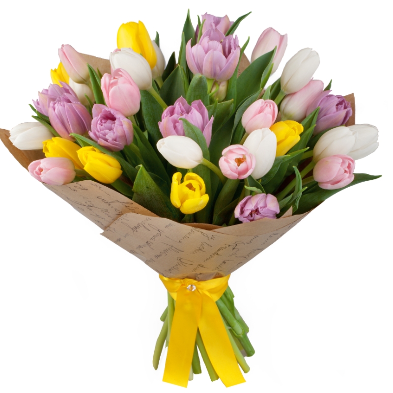 Букет из 35 разноцветных тюльпанов в крафте