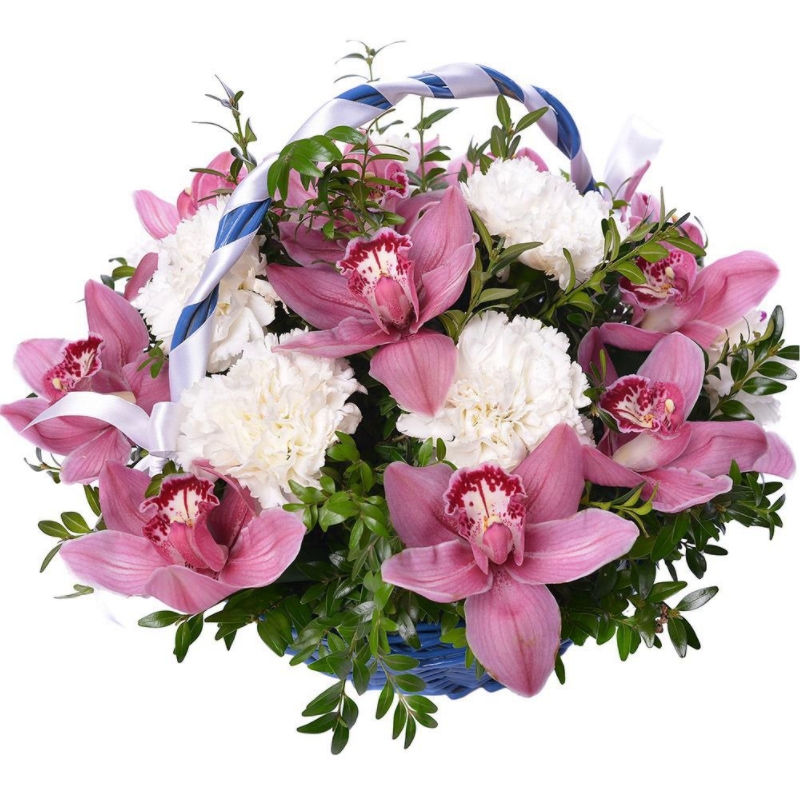 Букет состоит из 11 орхидей, 8 гвоздик, зелень, корзина, оазис.