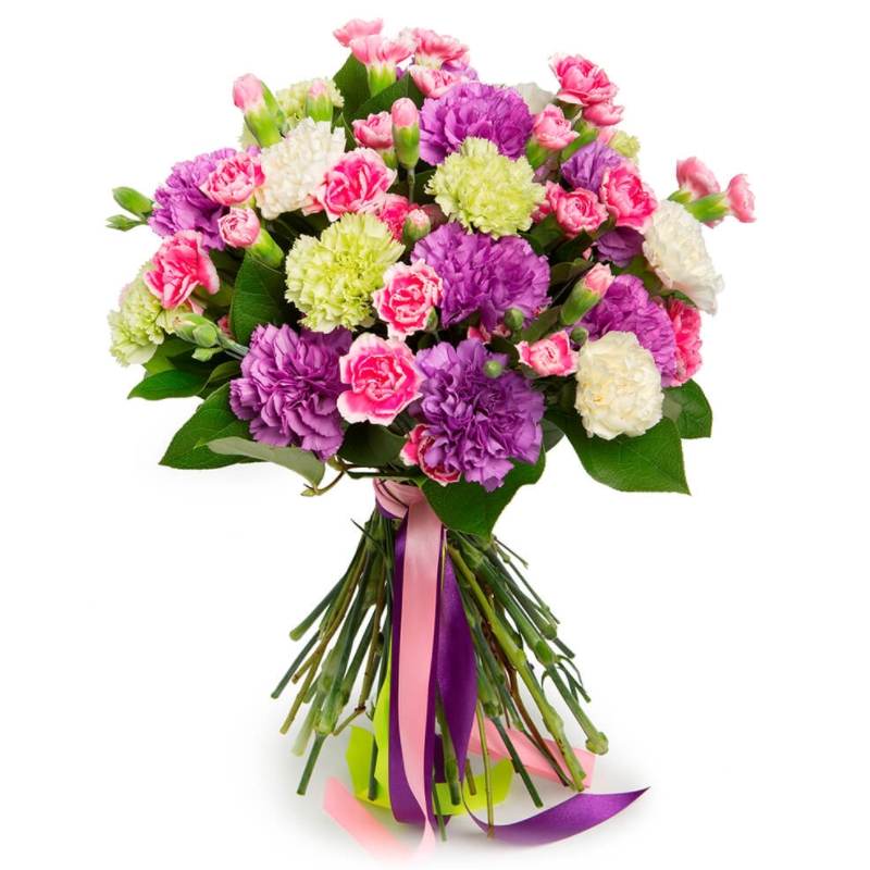 Букет состоит из 23 гвоздики, 7 кустовых гвоздик, салал, прозрачная упаковка, атласная лента.
