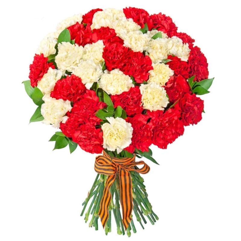 Букет состоит из 26 красных гвоздик, 25 белых гвоздик, зелень, прозрачная упаковка, лента.