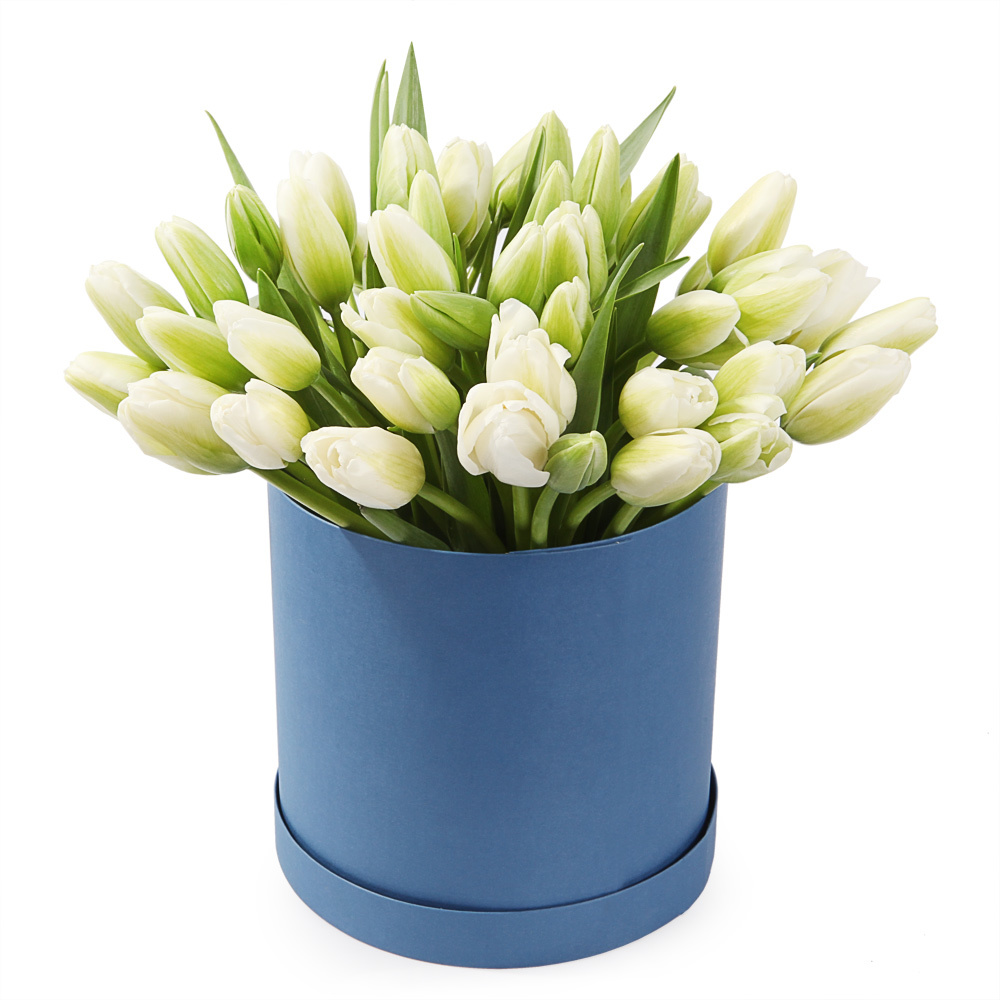 45 белых тюльпанов, шляпная коробка.