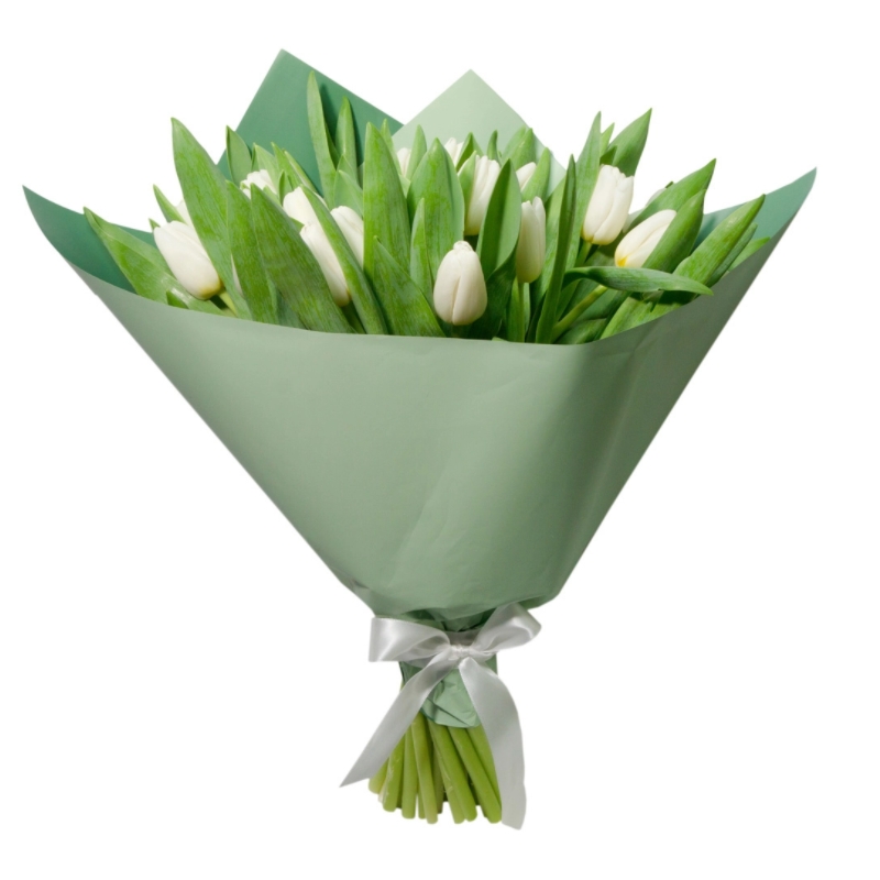 Букет состоит из 15 белых тюльпанов, красивая упаковка, атласная лента.