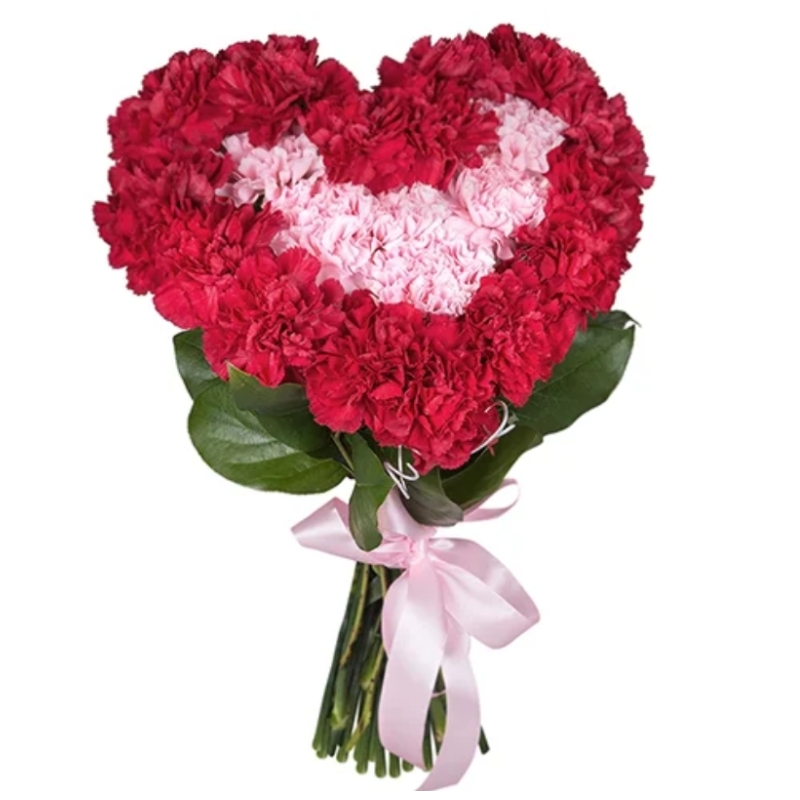 Букет состоит из 24 красных гвоздик, 7 розовых гвоздик, прозрачная упаковка, атласная лента.