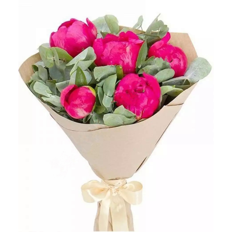 Букет состоит из 5 красных пионов, эвкалипт, крафт, атласная лента.