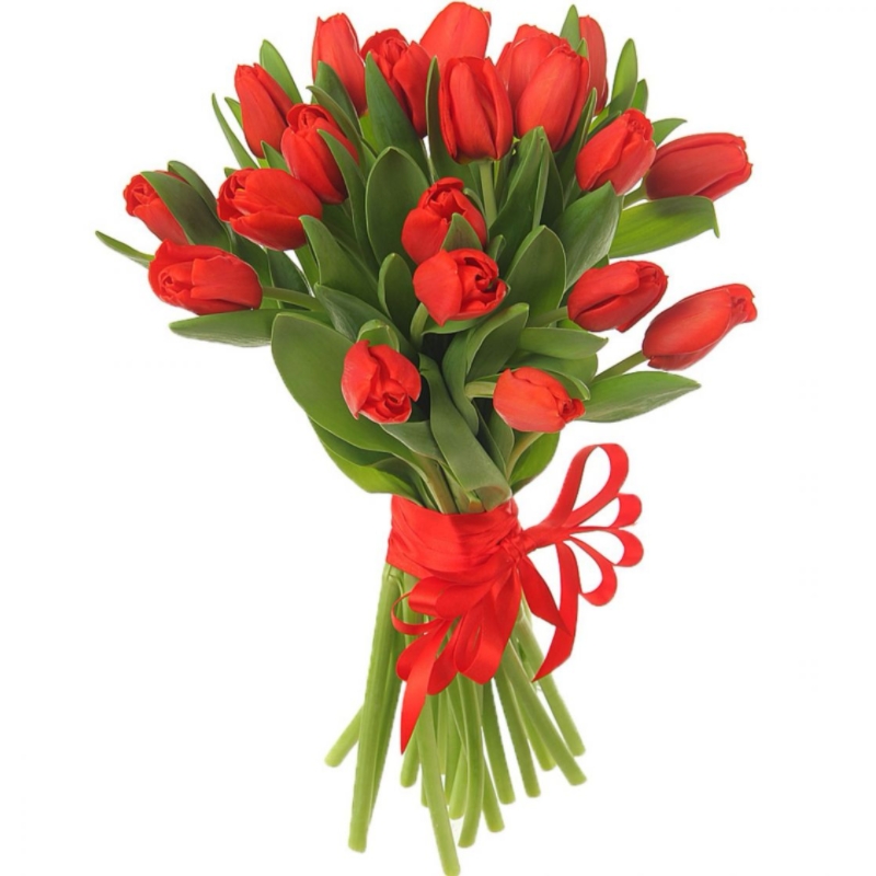 Букет состоит из Букет из 19 красных тюльпанов, прозрачная упаковка, атласная лента.