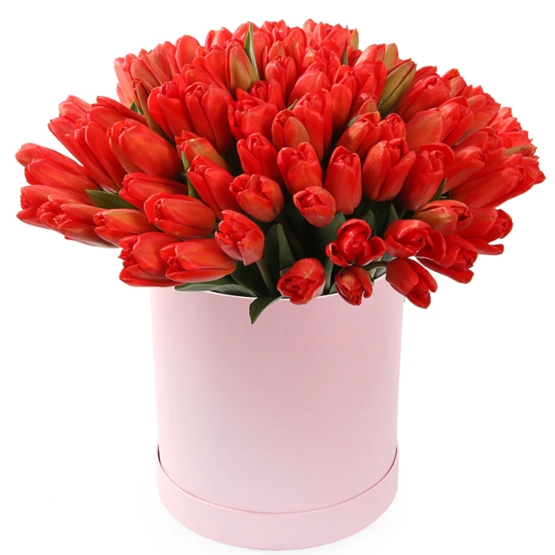 Букет из 75 красных тюльпанов в коробке.