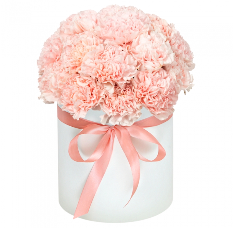 Букет состоит из 27 розовых гвоздик, коробка, атласная лента, оазис.