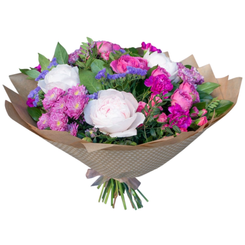 Букет состоит из 3 пиона, 3 ветки хризантемы, 4 ветки кустовых роз, 7 гвоздик, 3 статица, зелень, крафт, атласная лента.