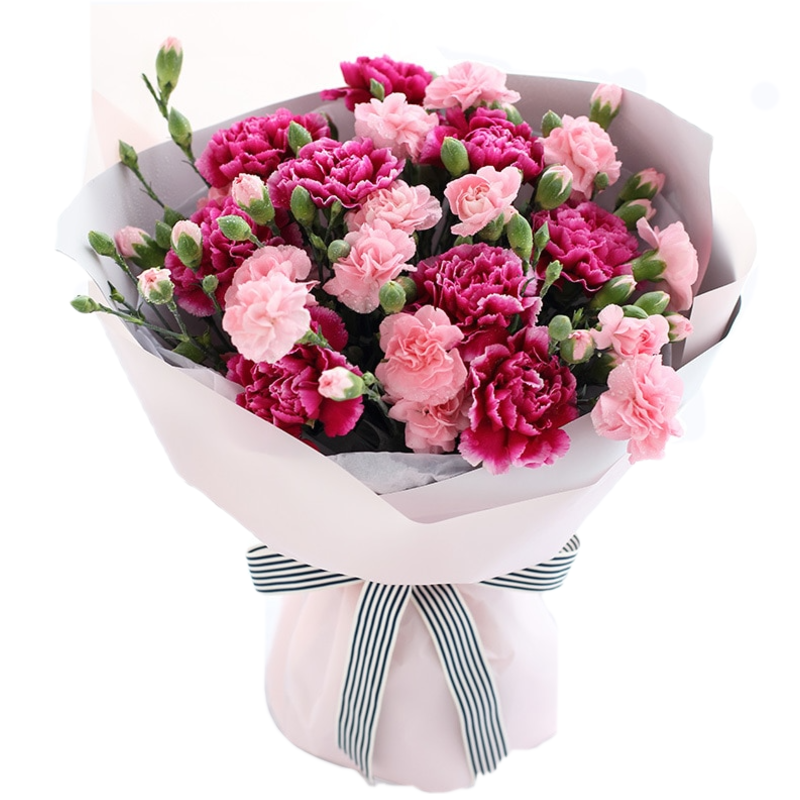 Букет состоит из 9 стеблей фиолетовой гвоздики, 10 веток розовой гвоздики, красивая упаковка, атласная лента.