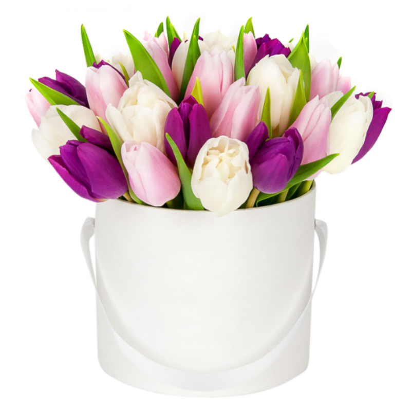 Букет состоит из MIX из 27 сиреневых / розовых и белых тюльпанов, коробка, оазис.