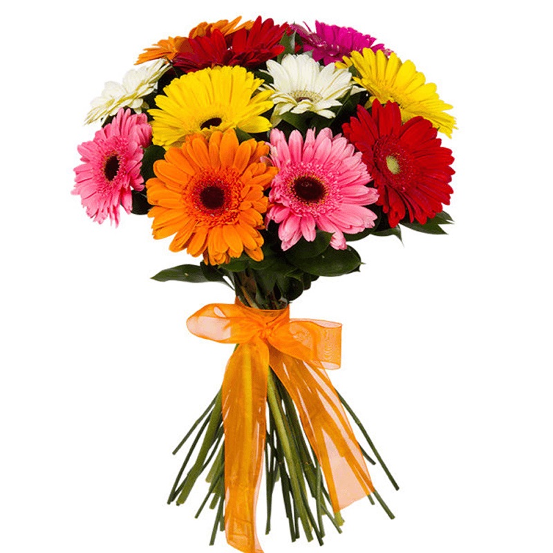 Букет состоит из MIX из 15 оранжевых / розовых / желтых / красных / белых гербер, прозрачная упаковка, атласная лента.