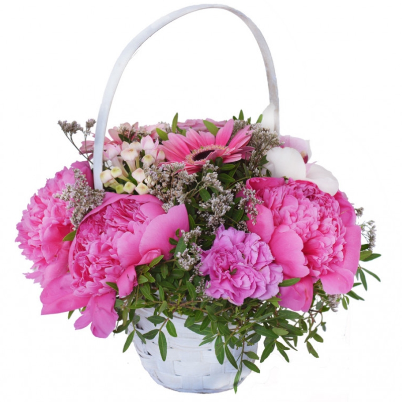 Букет состоит из 5 пионов, 2 розы, 2 гербера, 2 орхидеи, 1 бувардия, 3 лимониум, зелень, корзина, оазис.