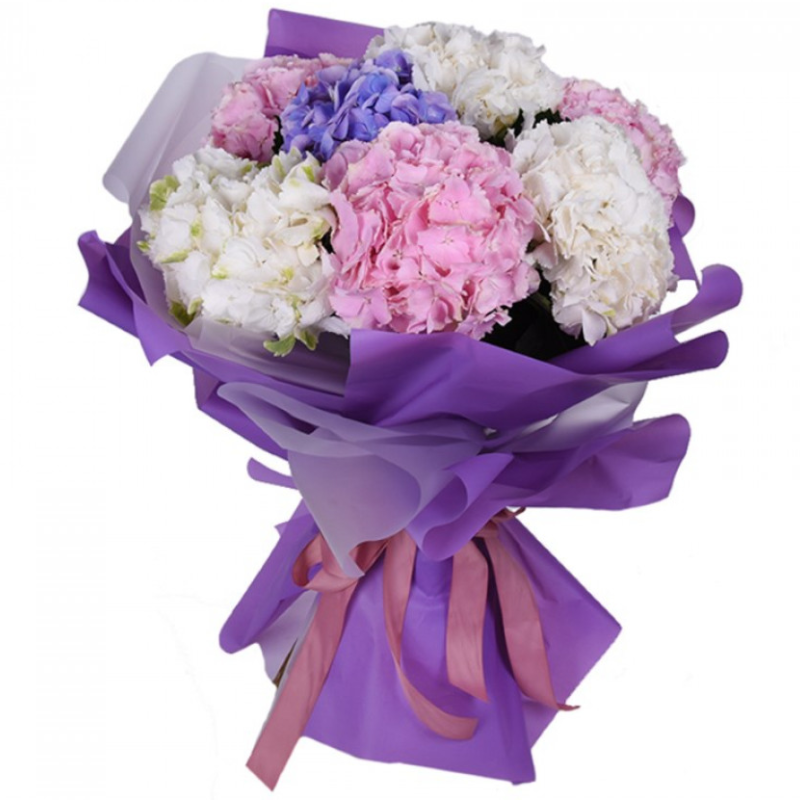 Букет состоит из 7 разноцветных гортензий, красивая упаковка, атласная лента.