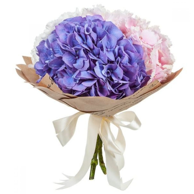 Букет состоит из 3 гортензии, крафт, атласная лента.