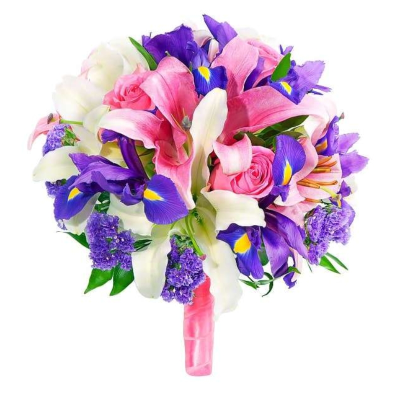 Букет состоит из 2 ветки белой и розовой лилии, 7 ирисов, 4 розовые розы, 3 статица, рускус, атласная лента.
