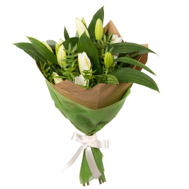 Букет состоит из 3 белые лилии, зелень, крафт, атласная лента.