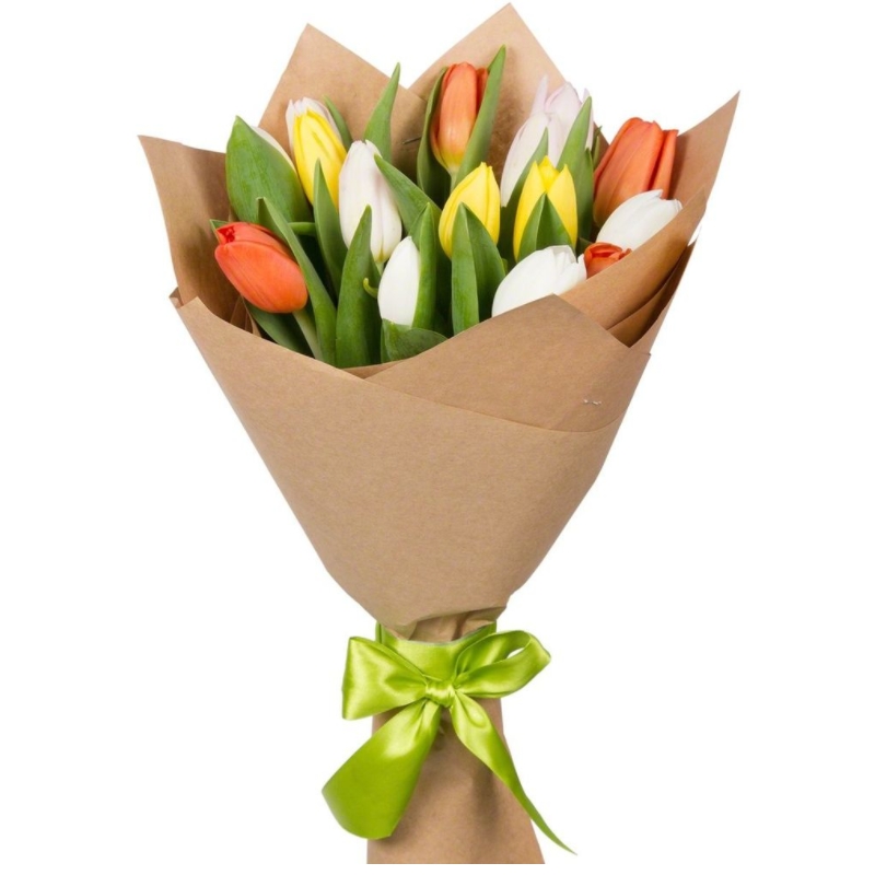 Букет состоит из MIX из 15 тюльпанов, крафт, атласная лента.