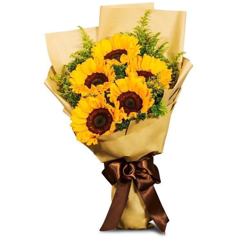 Букет состоит из 5 подсолнухов, 5 солидаго, крафт, атласная лента.