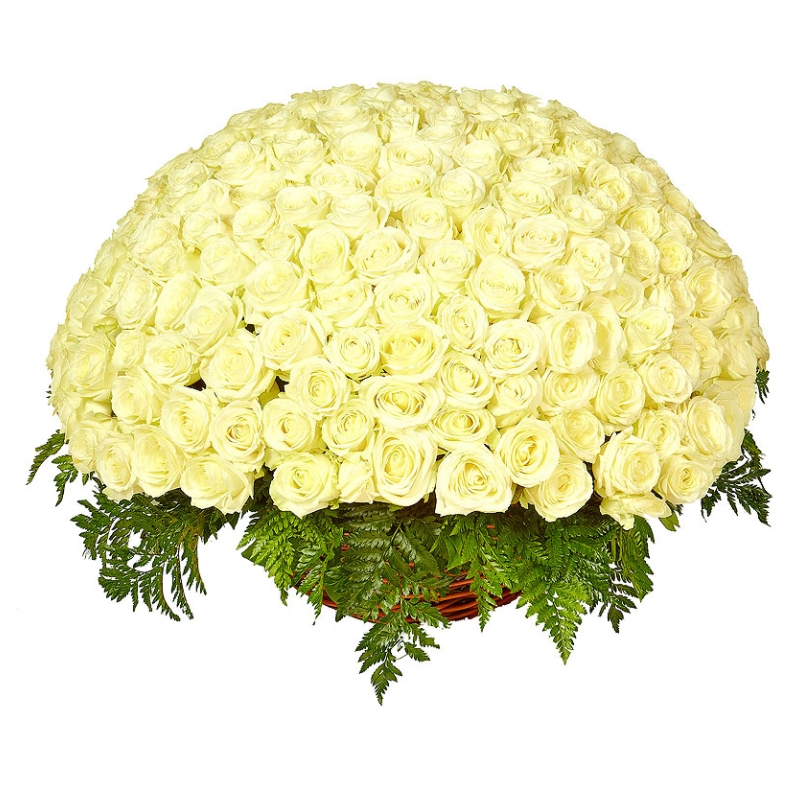 Букет состоит из 201 белая роза, папоротник, корзина, оазис.