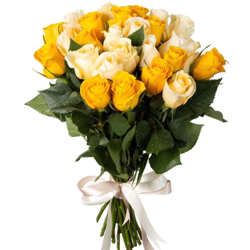 Букет состоит из 16 белых роз, 15 желтых роз, прозрачная упаковка, атласная лента.