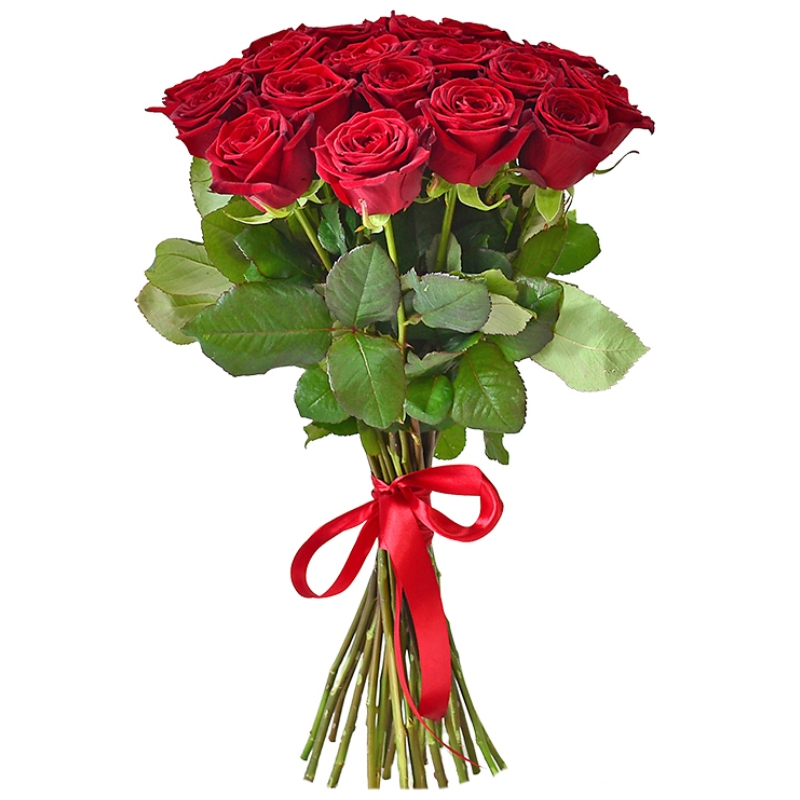 Букет состоит из 27 красных роз, прозрачная упаковка, красная лента.