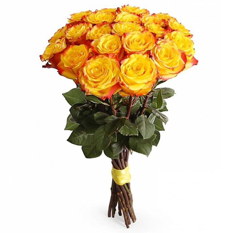 Букет состоит из 21 оранжевая роза, прозрачная упаковка, атласная лента.