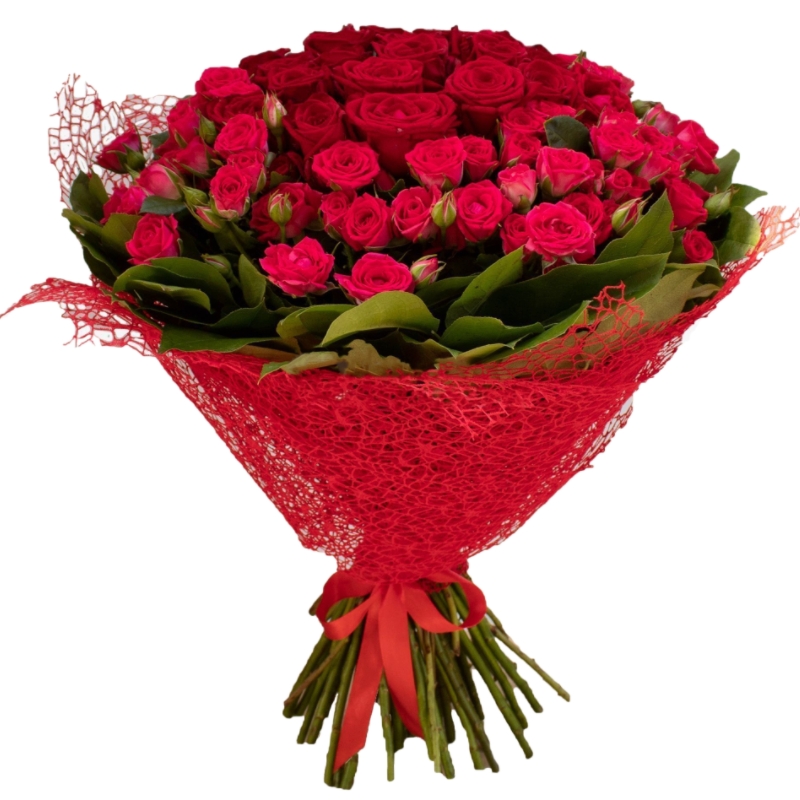 Букет состоит из 19 красных роз, 20 кустовых роз, зелень, красивая упаковка, атласная лента.